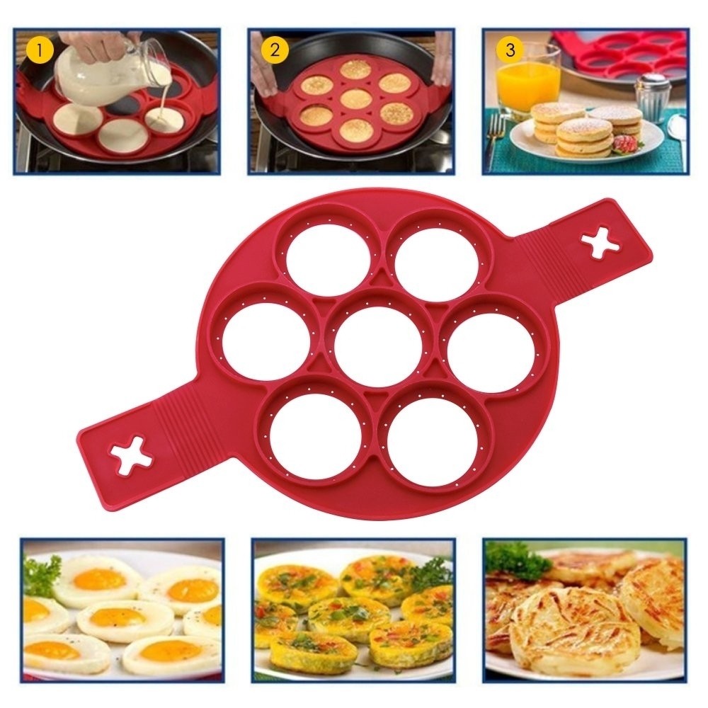Aceasta forma din silicon alimentar vine in ajutorul dumneavoastra pentru ca mini clatitele sau ouale prajite sa iasa perfect rotunde. De asemenea, nu se vor mai rupe sau deforma, cand sunt intoarse. Datorita utilizarii universale, se poate folosi pentru prepararea oualor prajite, mini clatitelor, friganelelor, prajiturilor mici, omletelor, etc. Cu aceasta forma speciala, se prepara cate 7 mini portii simultan.