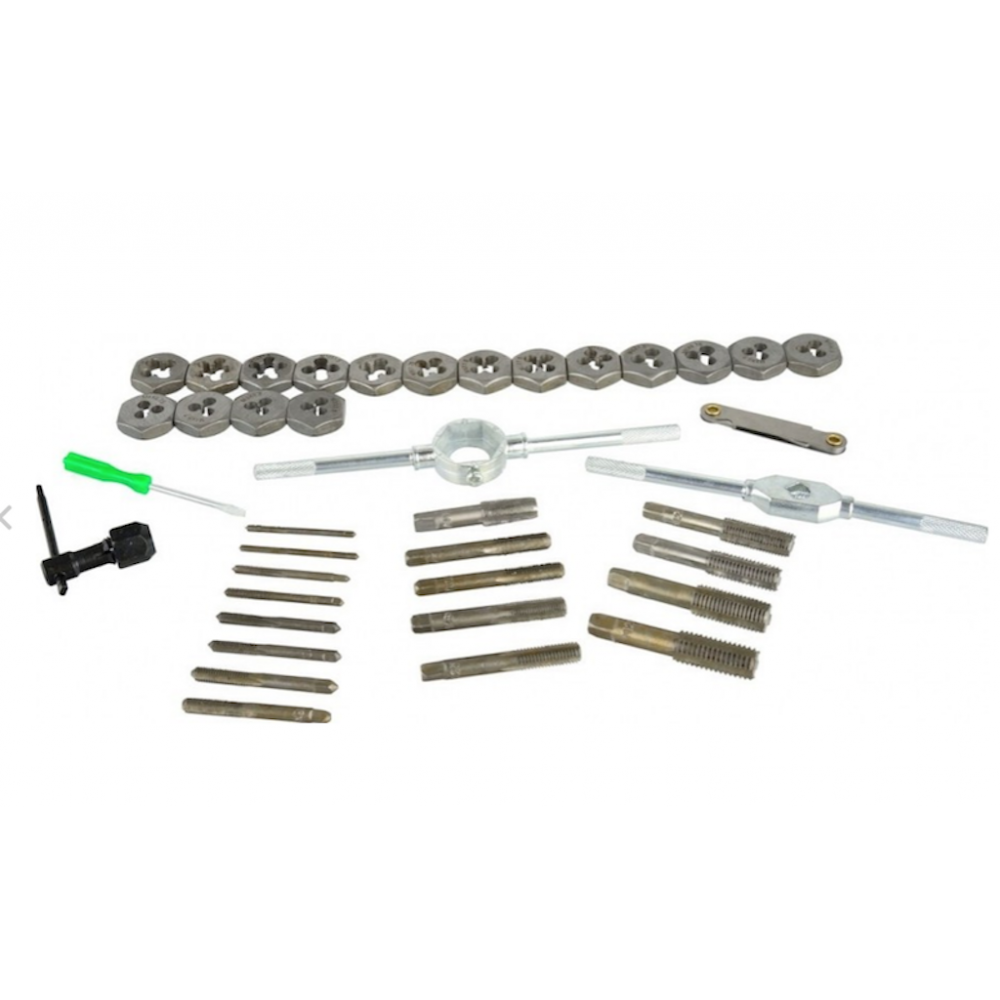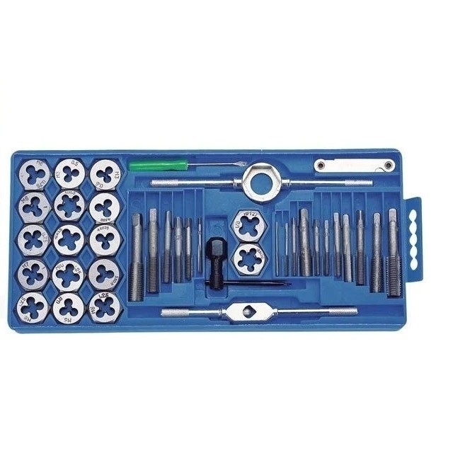 Trusa profesionala de tarozi si filiere contine 40 de piese ideale pentru reparatia sau executarea filetelor pentru piulite si suruburi.