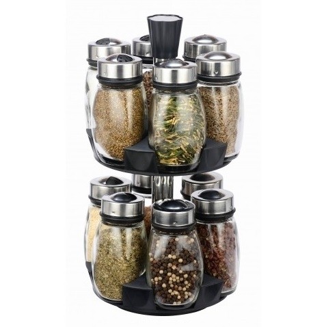 Setul pentru condimente este format din 13 piese, contine 12 recipiente pentru condimente şi un suport rotativ pentru depozitarea acestora.